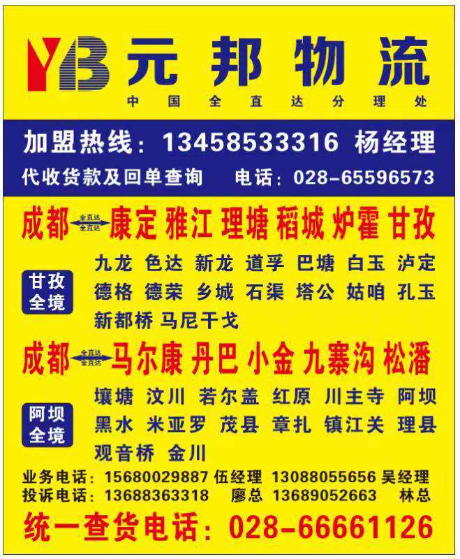 成都到到九龍物流專線、茂縣、汶川、理縣、馬爾康、黑水、松潘、九寨溝、金川、紅原、若爾蓋、壤塘、阿壩縣、色達、石渠、甘孜縣、德格、白玉、新龍、道孚、丹巴、雅安、康定、雅江、理塘、巴塘、得榮、鄉城、稻城、九龍、木里、攀枝花、寧南、西昌、雷波、越西、馬邊、漢源